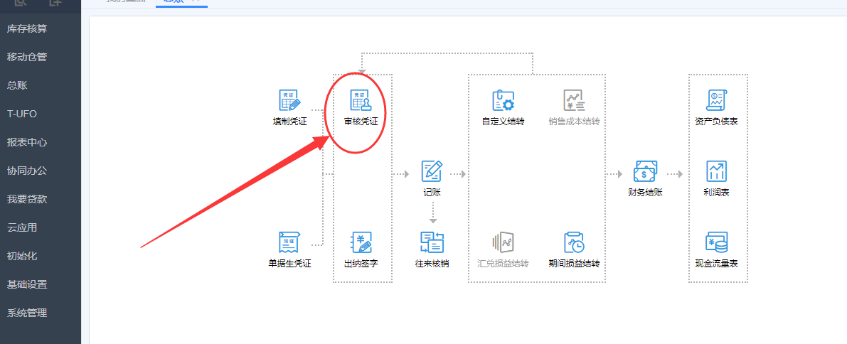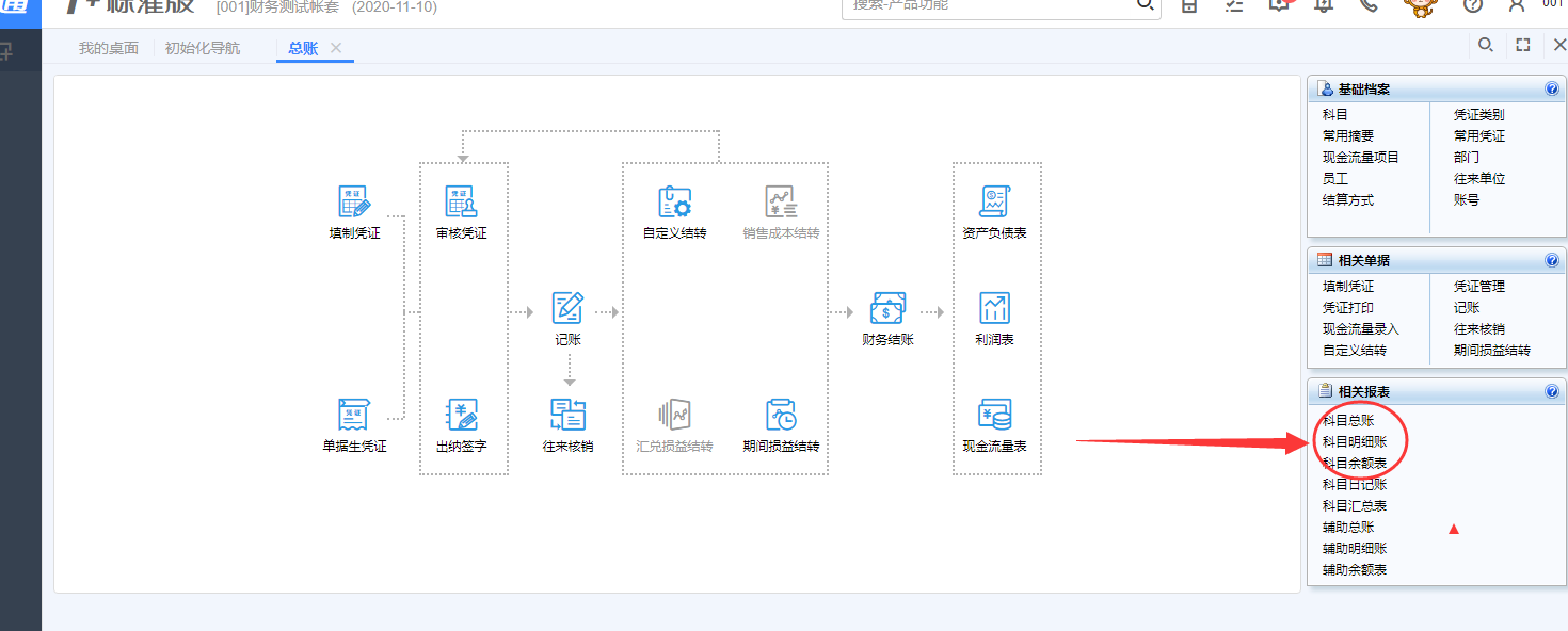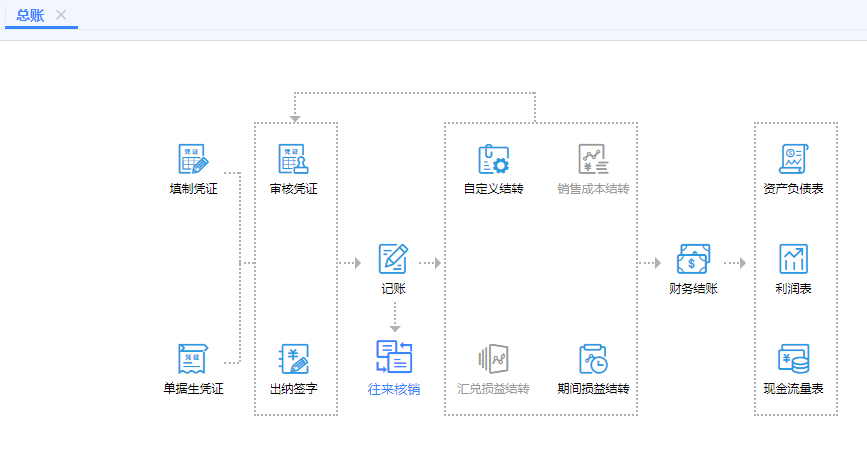 进入之后点左边的总账菜单,然后就会弹出总账处理的流程图,鼠标放在总账菜单上的时候,也可以看到好多菜单,点下去,右边就会弹出流程图。