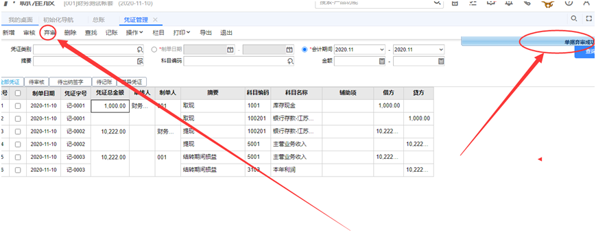 取消审核:也是在这个界面,勾选之后点上面的弃审即可。这里要注意的是,自己不能弃审别的凭证,只能弃审自己审核的,如果提示失败,要么没有取消记账,要么不是自己名字审核的凭证。
