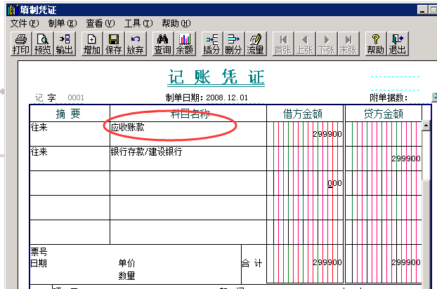 下面接着选择第二分录科目,然后录入贷方金额,或者也可以直接按键盘上的等号,软件会自动平衡带入贷方数字,最后点菜单上的“保存”,一张凭证就成功录入了。