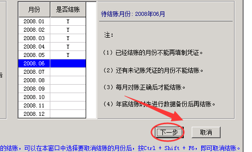 选中最后一个月的月末结账状态,然后按照下面的提示按住键盘上的ctra+shift,然后去按F6,就会弹出一个输入密码的框子,那个密码是你操作员登录软件的密码,没有就直接点确定,然后这里的标志就没了,结账也就取消了。