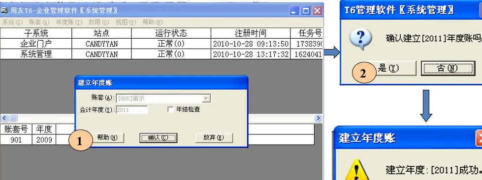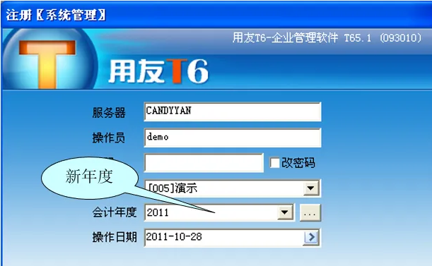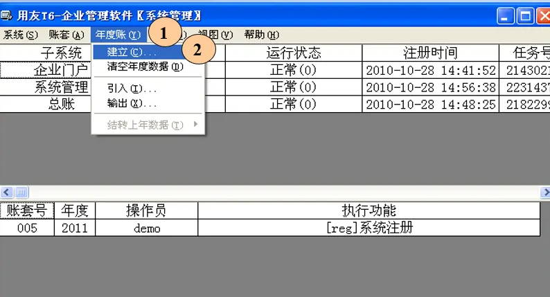 我们这里演示的是新建2011年度,建成功之后,再点上面的菜单------系统--------注销-------然后再点系统---------注册