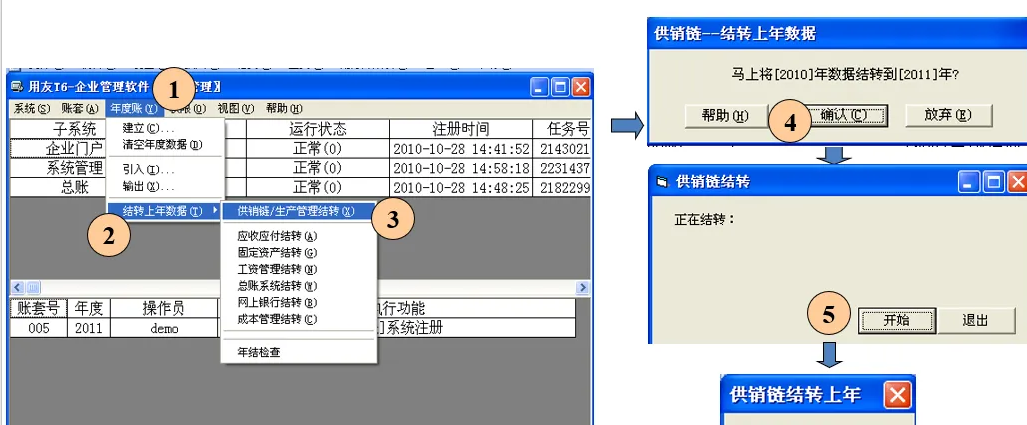 这里要注意的是结转上年数据之后,右边有几个选项,我们只要选我们需要结转的模块,如果只有总账模块,就只点总账系统结转即可,如果有其他模块,则按照顺序从上往下一个一个点结转,还有右边第四个图提示的,是将2010年数据结转到2011年,这个看清楚,如果登录的年度错了(2020年度登录的),有可能会提示2019年结转到2020年。