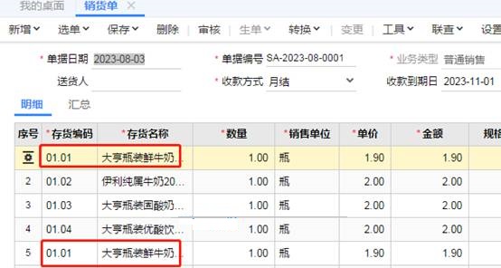 1、如图下,可以看出序号1行与序号5行中的存货是同一个商品,这就是同一个商品同时录入了两次