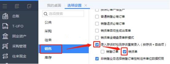 3、点击销售页签,勾上“录入存货时检测存货重复录入(按存货+自由项)”,同时勾上“销货单”然后保存,如图下: