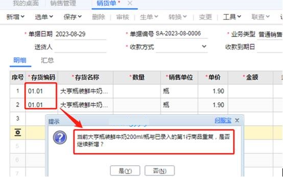 4、再来录入送货单,当第一行与第二行商品相同时,就会跳出重复的提醒,如图下: