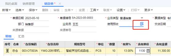 4、设置完成后再来录单就可以直接“使用预收”,对之前的预收款来进行核销了,如图下:
