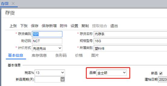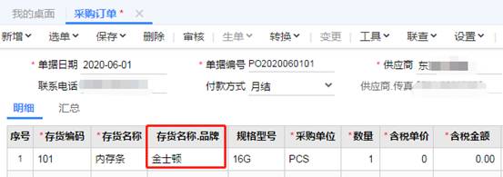 1、如图下品牌字段已经录入,而做采购订单时表体明细也没有品牌字段