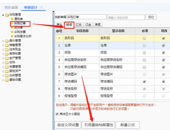 3、选择采购订单,点击明细页签中的引用基础档属性,如图下操作: