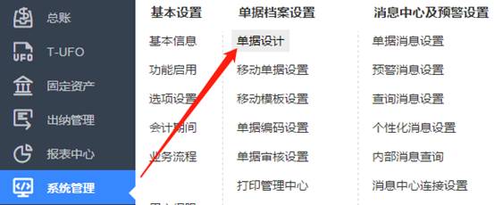 2、鼠标放置在系统管理,在跳出的菜单中点击单据设计,如图下: