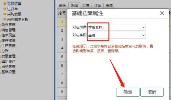 4、对应档案选择为存货名称,对应字段选择为品牌并确定,如图下: