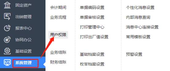 鼠标放置在系统管理,在跳出来的菜单中点击“用户权限”,如图下: