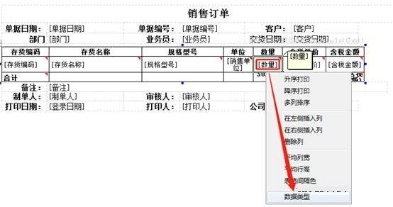2、选中需要设置的模板,点击“数量”单元格,鼠标右键数据类型,如图下: