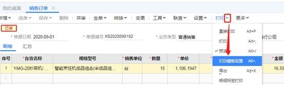 1、登录畅捷通T+标准版,以销售订单为例,点击打印-打印模板设置,如图下: