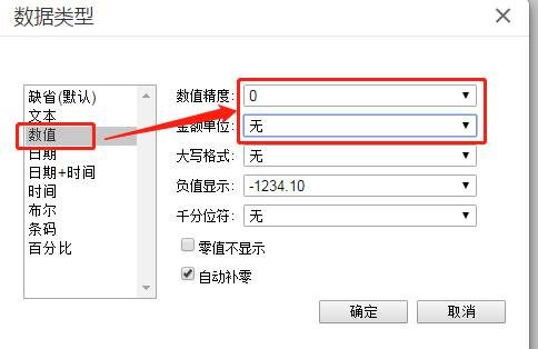 3、点击数值,在数值精度处选择为0,金额单位选择为无并确定,如图下: