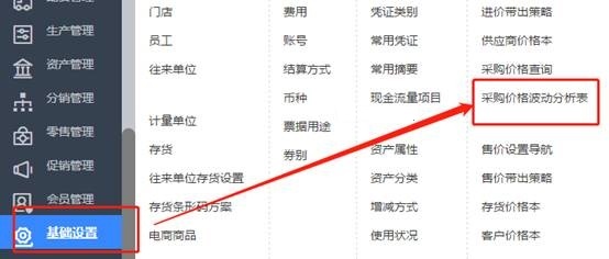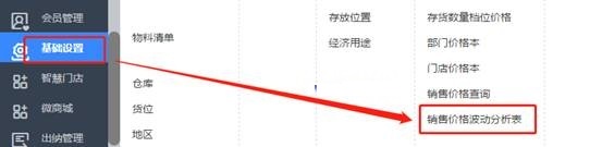 4、鼠标放至“基础设置”在跳出来的菜单中点击“销售价格波动分析表”,如图下: