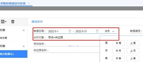 2、选择所要分析的单据日期,日期可以按月、按季、按年、按周等来分析,对像为“存货+供应商”,然后点击查询,如图下:
