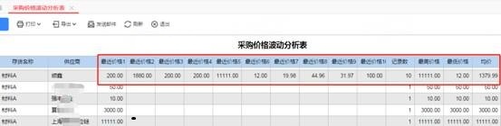 3、进入采购价格波动分析表就可以看到材料的最近十次价格,以及最高价、最低价、均价,如图下:
