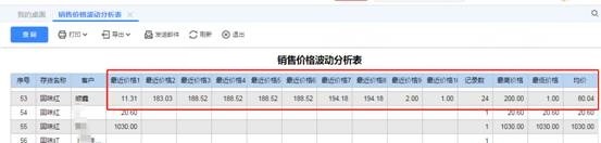 6、进入销售价格波动分析表就可以看到产品的最近十次价格,以及最高价、最低价、均价,如图下: