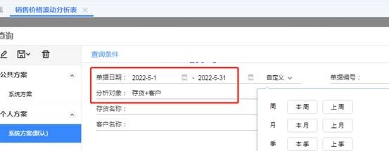 5、选择所要分析的单据日期,日期可以按月、按季、按年、按周等来分析,对像为“存货+客户”,然后点击查询,如图下: