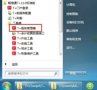 答:以上提示可以看出来是畅捷通T+标准版相关服务服务没有启动,所以才登录不了,那么现在就到T+服务管理器,看看是哪个服务没有启动,点击服务器电脑左下角开始-所有程序-T+服务管器,如图下: