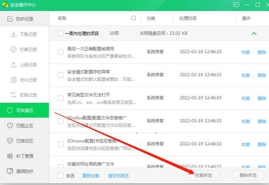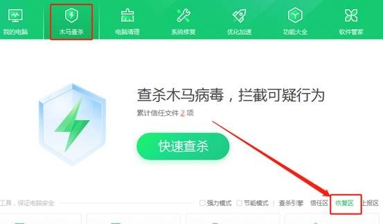 但仔细核对后发现服务只有三项服务,少了一项TPlusStdUpgradeService1300服务,仔细询问后原来客户最近有清理杀毒,导致此服务的的文件被误删除了,那么就要到杀毒软件中去恢复,点击360木马查杀-恢复区,找到相关的服务文件恢复所选即可,如图下操作: