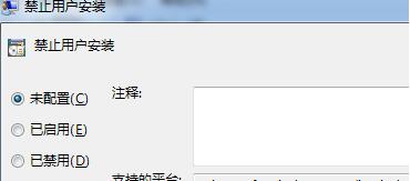 2、找到“计算机配置”-->“管理模板”-->“windows组件”-->“Windows Installer”-->有个“禁止用户安装”的配置项,把它改成未配置,如下图所示。