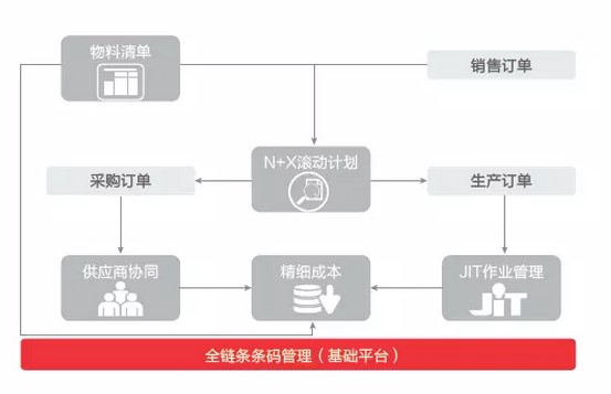概括来讲,所谓的智能生产管理模式,就是从接到销售订单,到根据销售订单编制发货计划,企业内部的N+5滚动计划,上线计划、组织订单、采购订单,生产订单,采购订单同时进入供应商协同平台,生产订单只是到工序,然后完成调拨,产成品入库,以及管理到我们销售发货,应收帐款。整个流程中,条码贯穿到每个关键点的管理。通过这种管理模式,给我们的效率和业务的准确度带来很大的提升,实现了我们智能制造的预期目标。