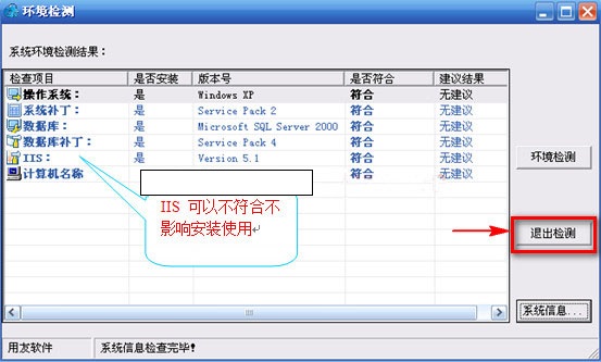点下一步后,又会跳出“环境检测”对话框出来,我们选择“退出检测”即可,再单击“下一步”。