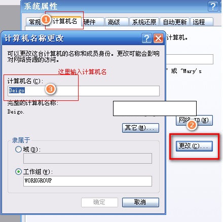 操作方法是: 我的电脑,右键,属性,计算机名,更改,改完后需要重启电脑。