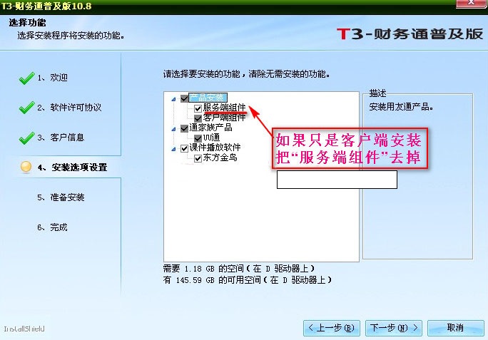 如果只是客户端安装要把“服务端组件”去掉,另外如果是T3用友通客户端安装,不需要安装数据库。