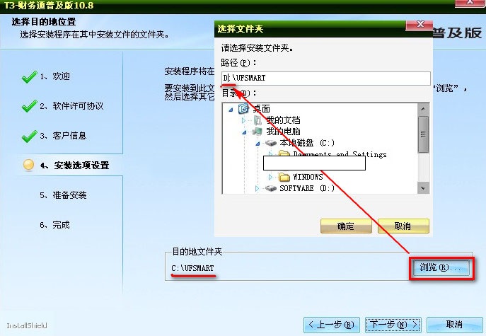 我们单击“目的地文件夹”右边的“浏览”把安装路径其中的C改成D就可以了。D:UFSMART