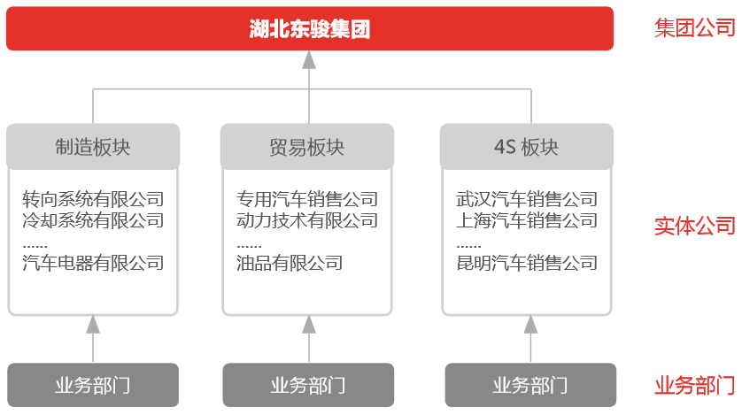 将湖北东峻预算责任主体分为贸易板块、制造板块、 4s板块,各板块下设实体公司及各个部门,共实体 公司26家,预算参与机构341个。通过这种层级的设 置,实现预算数据自动汇总到各实体公司、各系列或 板块、各业务版块直至东峻集团,帮助企业快速构建 和推进科学的预算管理体系。