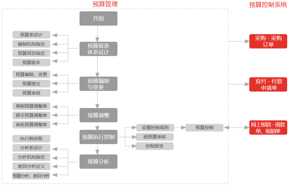 各个业务部门分别编制自己的预算并提交。财务部对提交的预算编制进行审核;财务部设置预算项目的控制规则;并对超预 算审批事项进行审批;各个业务部门分别填制自己的借款单、报销单,对应部门主管审批,财务审批并付款。