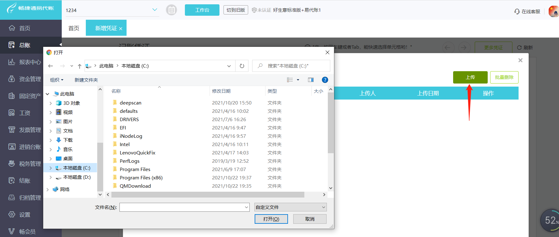 (8)导入凭证附件,进入附件,点击上传可以上传本地文件作为凭证附件