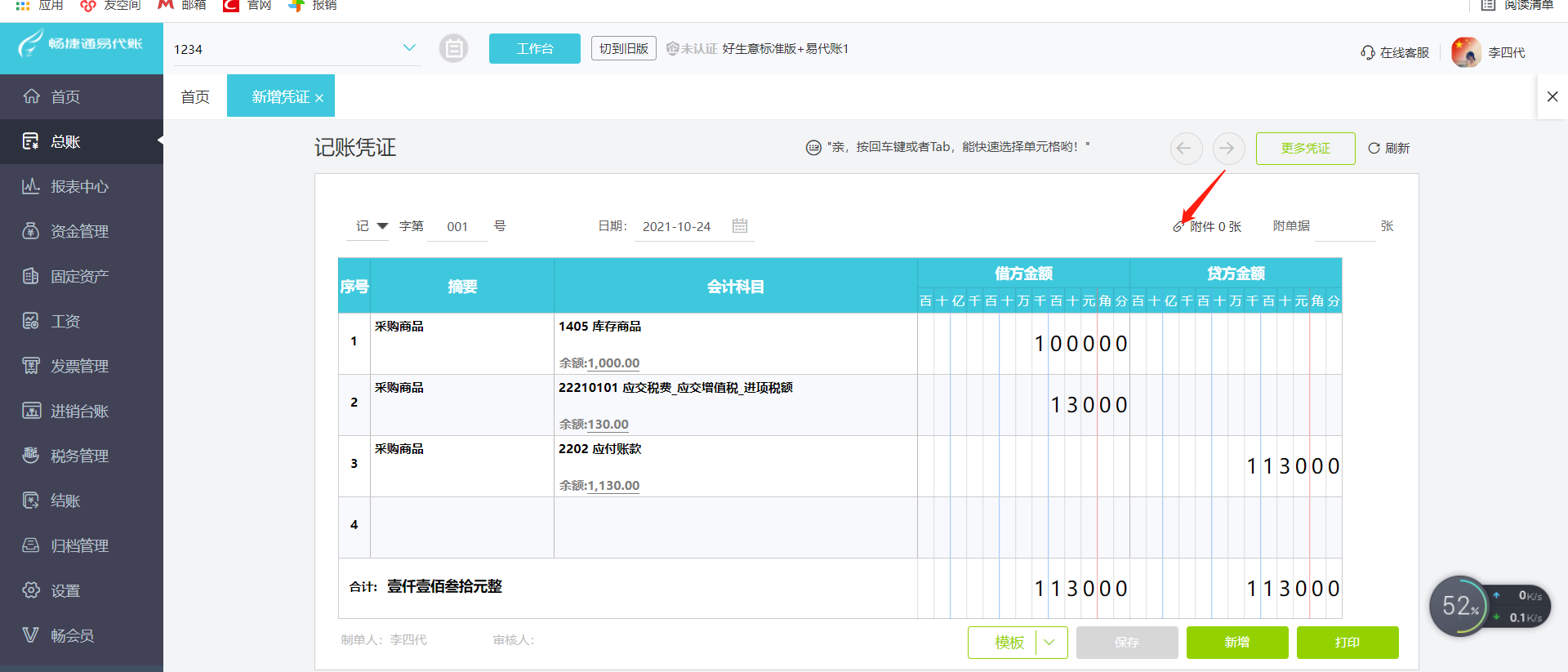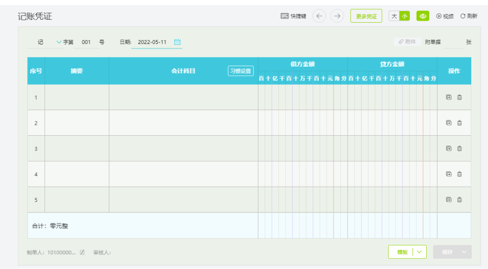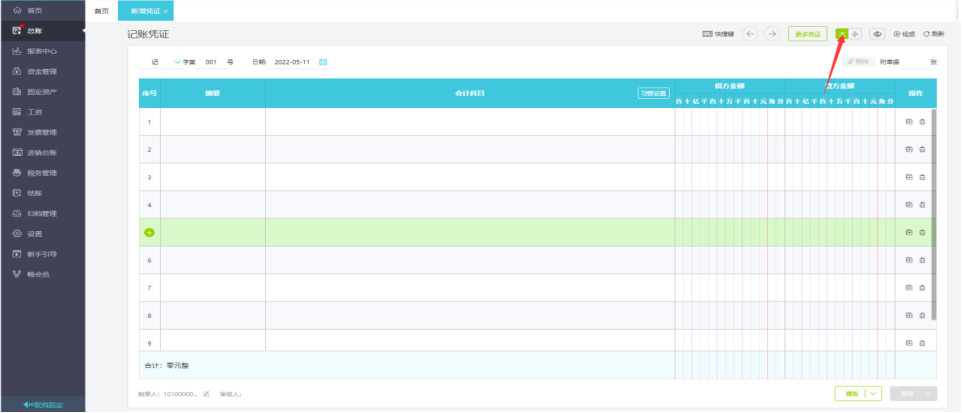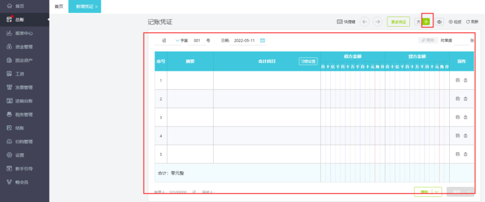 点击总账-新增凭证,可以进行大小模式切换,开启护眼模式