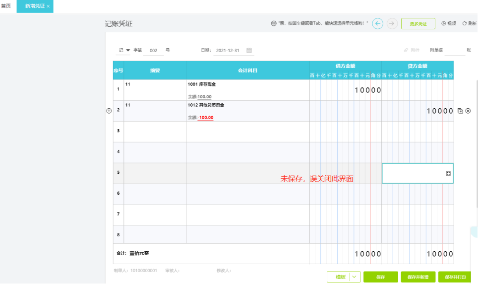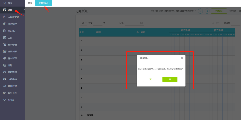 当新增凭证还未保存不小心关闭了页面的时候,重新进入系统会保存之前新增的凭证记录,点击确定可对凭证继续编辑之后保存