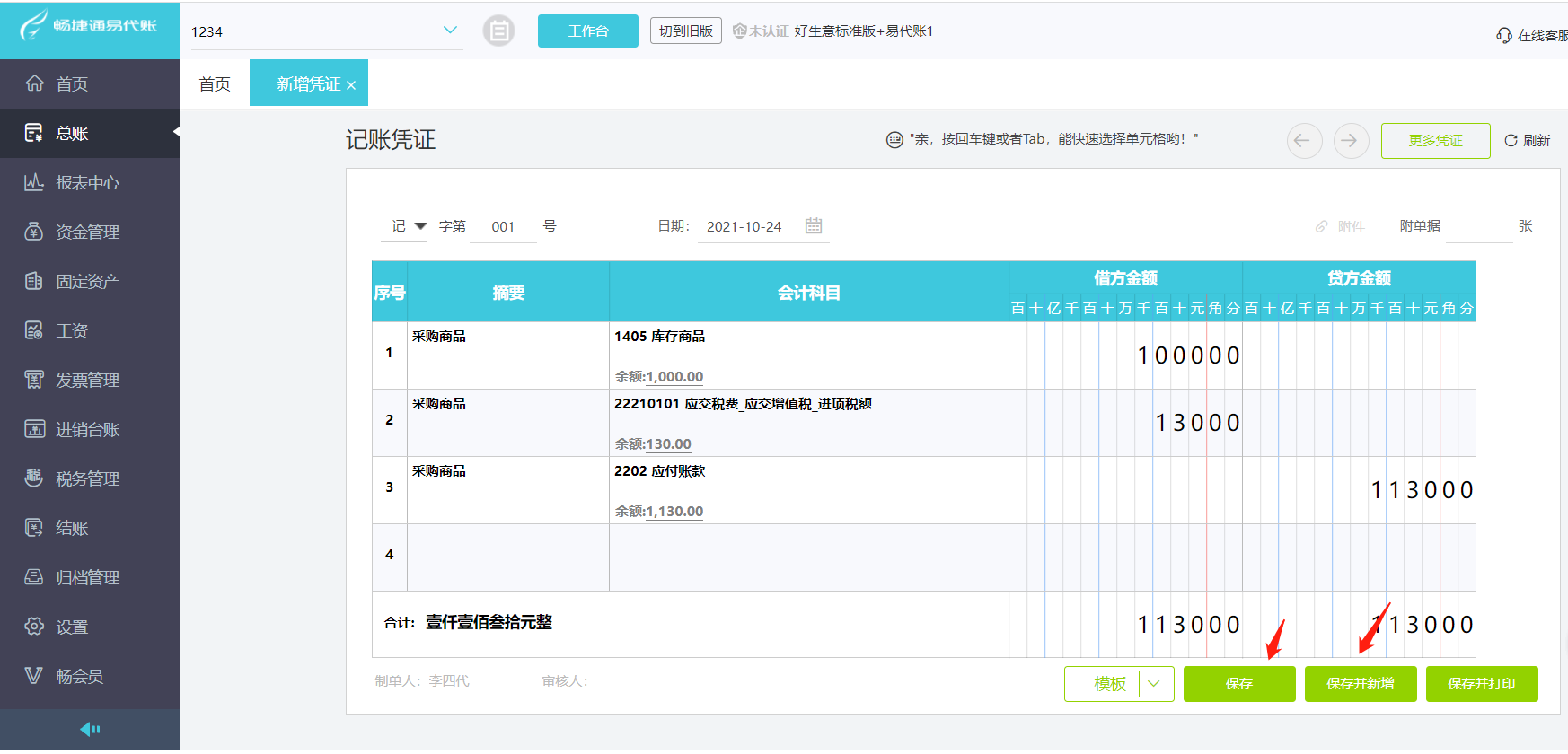 (7)点击【保存】\【保存并新增】,可以保存当前凭证,或进行编辑下一张凭证。