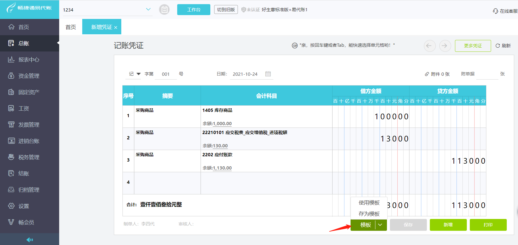 (1)保存好的凭证可以点击【模板】——【存为模板】,方便后期使用。