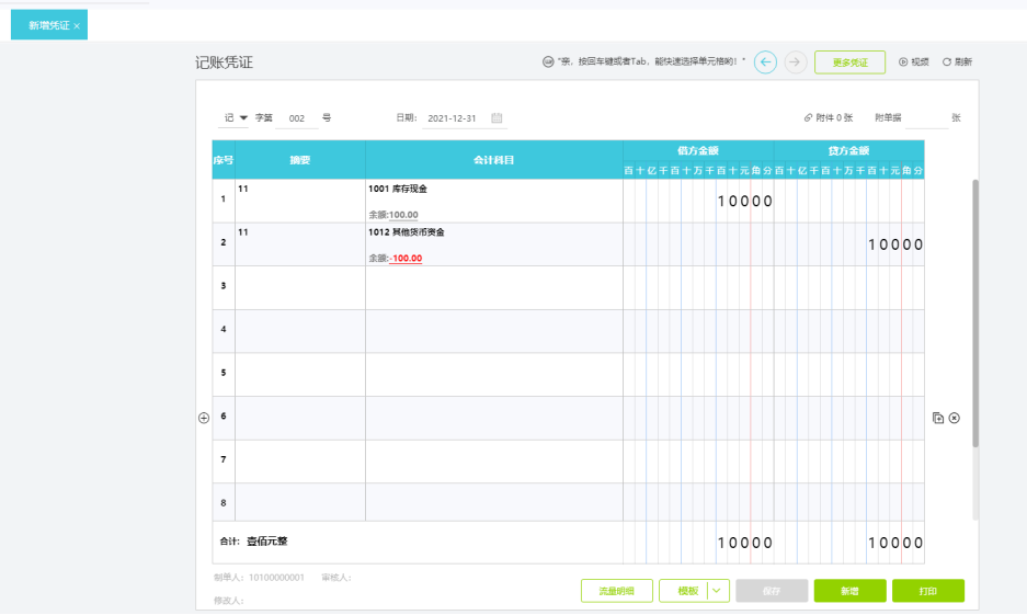 (2)凭证号:自动生成,可以点击修改。