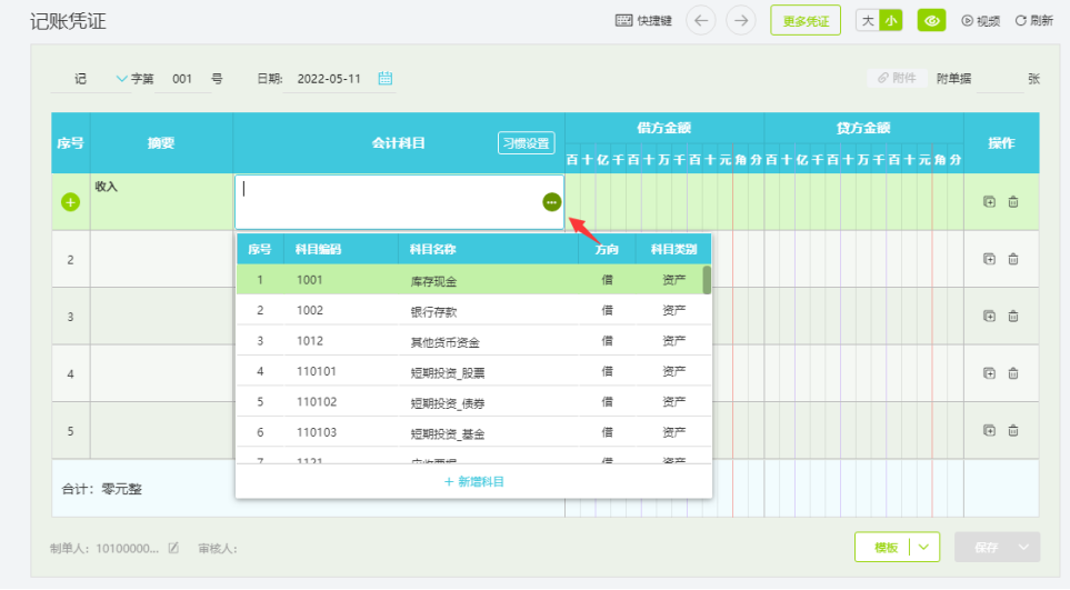 02 凭证界面可调出全部科目,方便查找!