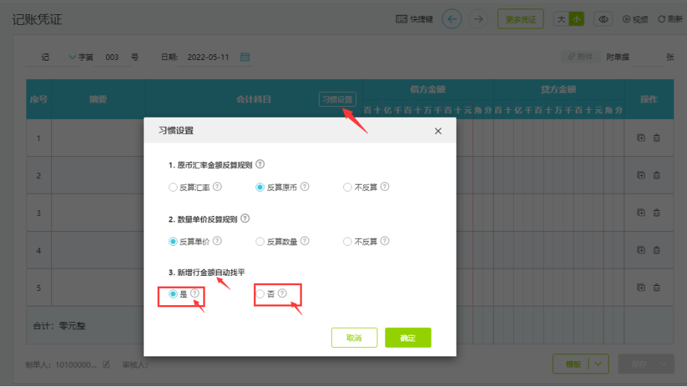 03 凭证录入新增下一行可进行设置规则,是否自动找平,更灵活!