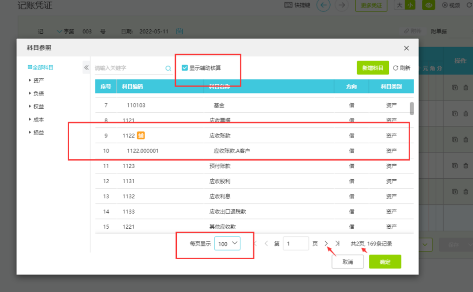 点击凭证界面上三个点,可调出全部科目,勾选辅助核算,同时显示辅助核算科目,更易查找科目