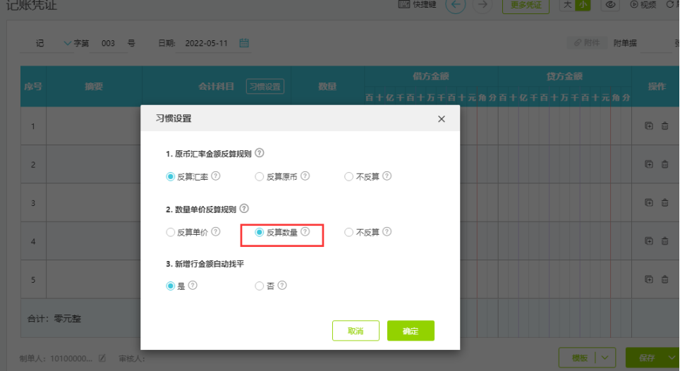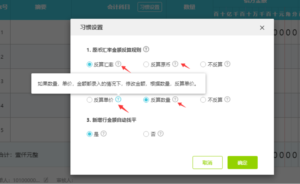 举例:库存商品科目带了数量辅助核算,能确认单价为10和总金额为1000,在习惯设置选择反算数量,系统会自动反算数量是多少