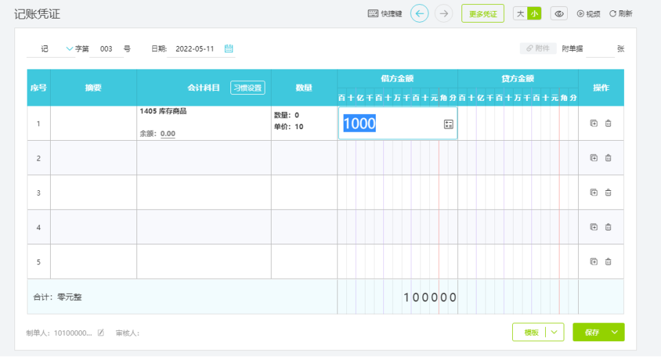 录入凭证时,输入单价和总金额