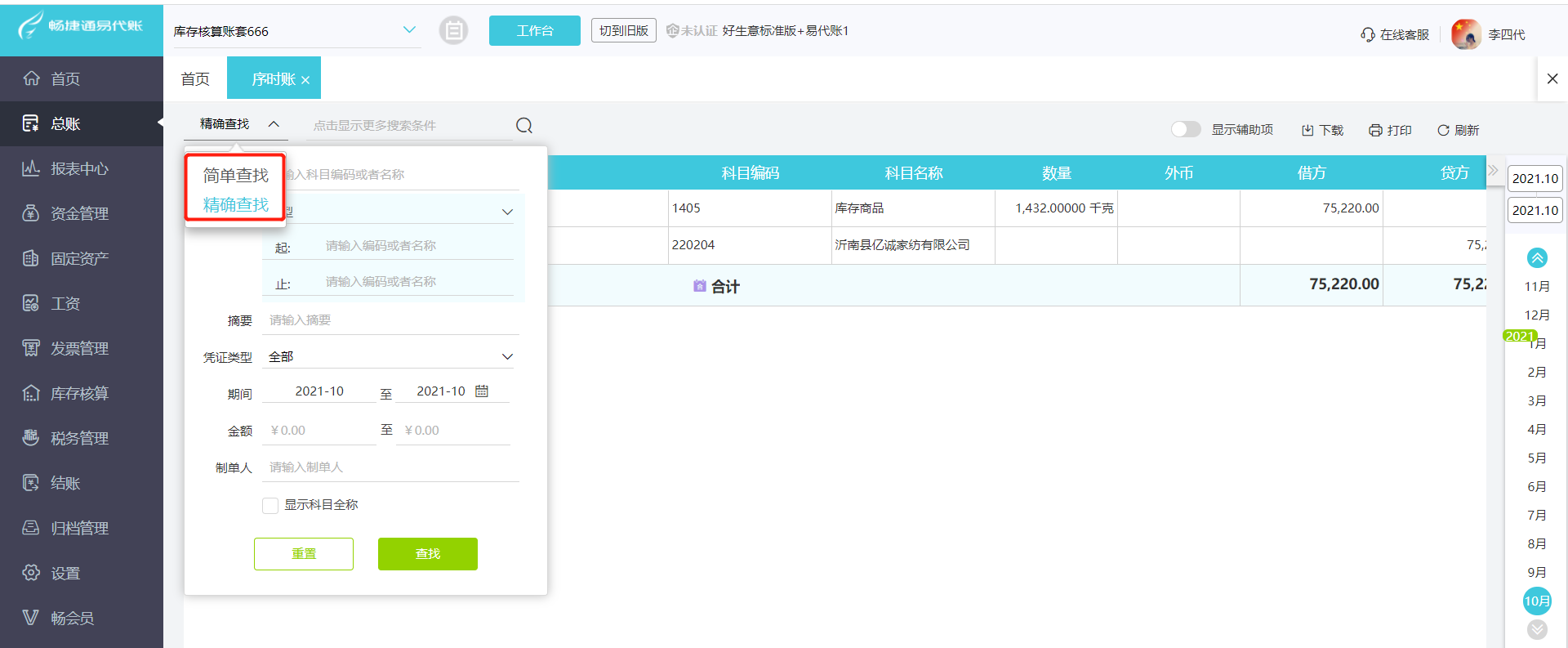 2.点击【简单查找】下的【精确查找】可支持按照科目、辅助核算、摘要、凭证类型、期间、金额、制单人等筛选条件筛选序时账。
