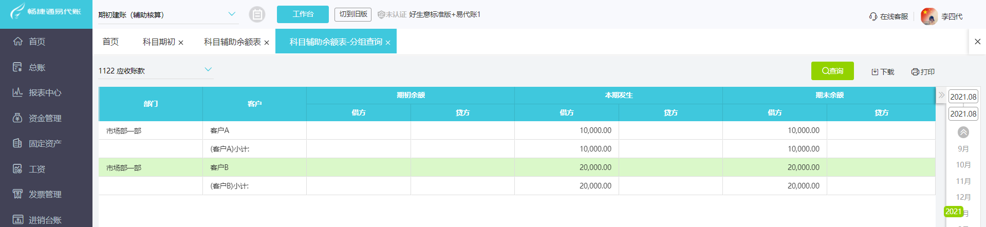 分组查询针对多辅助核算使用,例如需要查询市场一部下分别A和B客户的余额和汇总金额