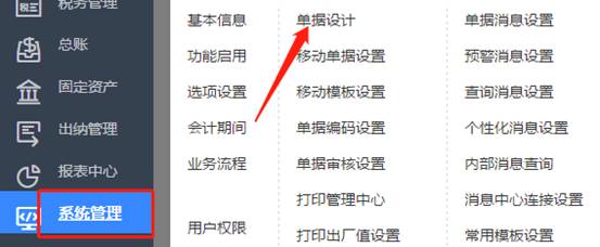 2、首先在采购订单表头增加公用自定项“采购合同号”,鼠标放至系统管理,在跳出的菜单中点击单据设计,如图下: