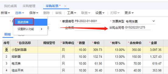 8、打开采购发票,可以看到此单据上也有采购合同号,点击选单-选进货单生成采购发票,会自动带入进货单上面的采购合同号,如图下: