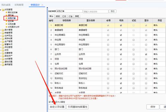 3、选中采购订单,点击自定义项设置,如图下: