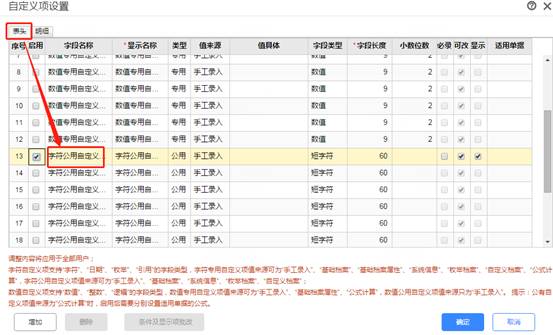 4、在表头页签中勾选启用“字符公用自定义项”,此处不能选择错了,如图下: